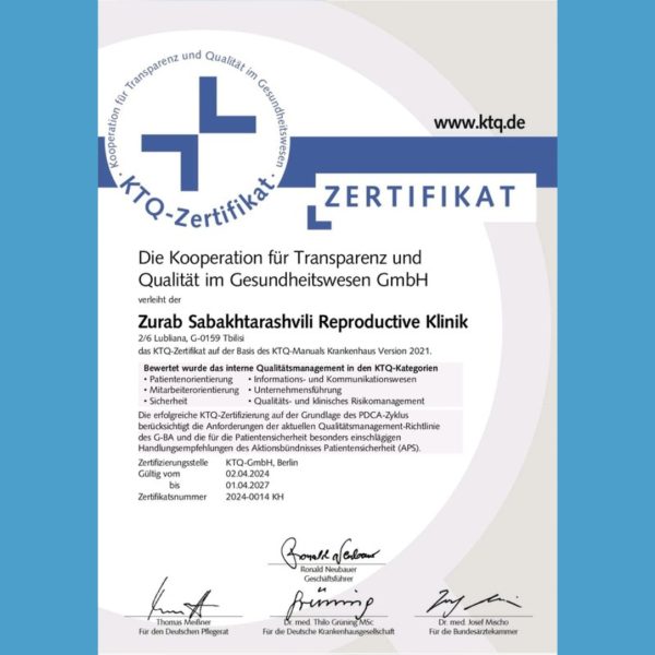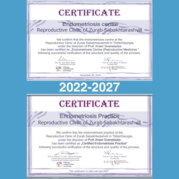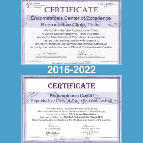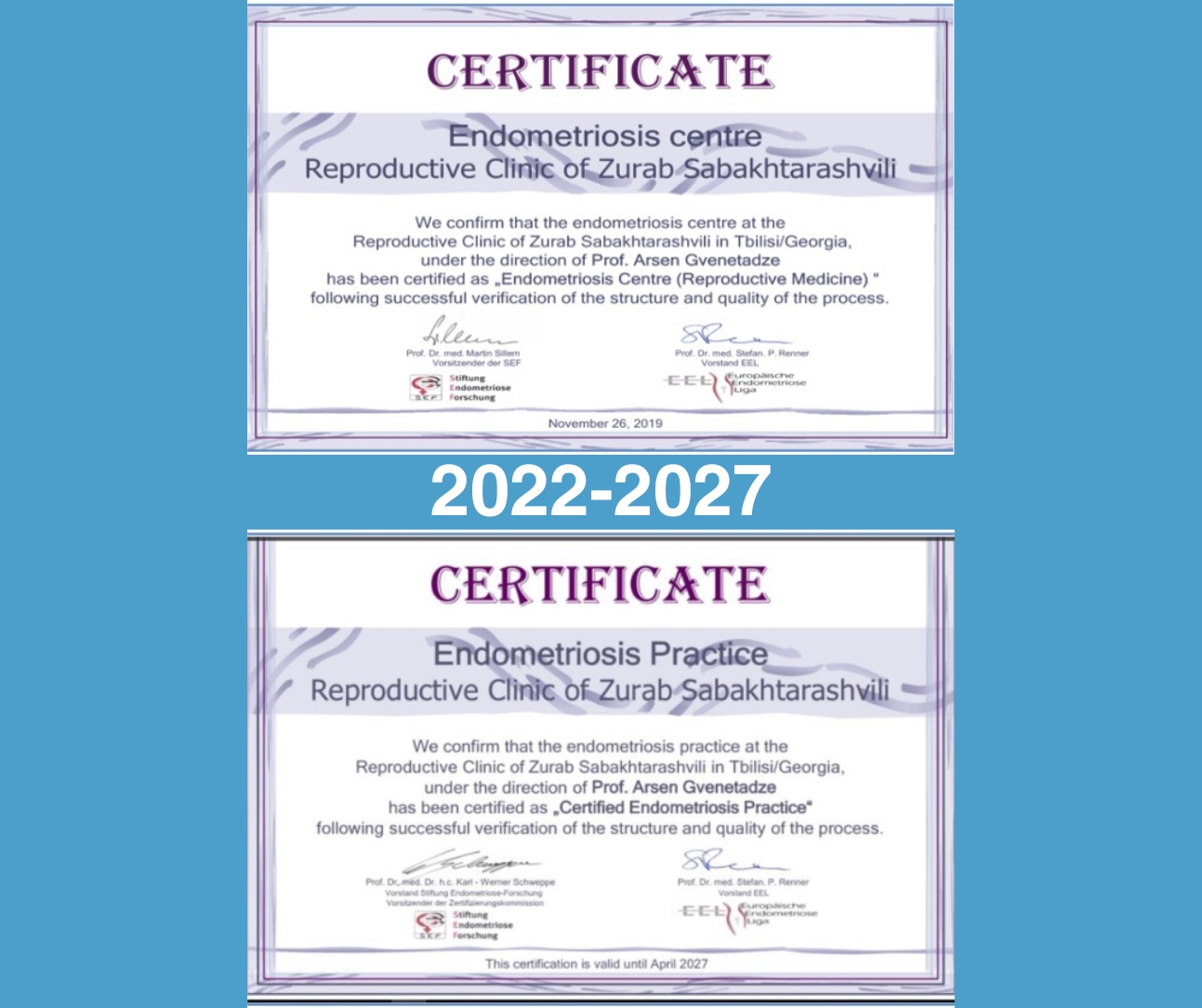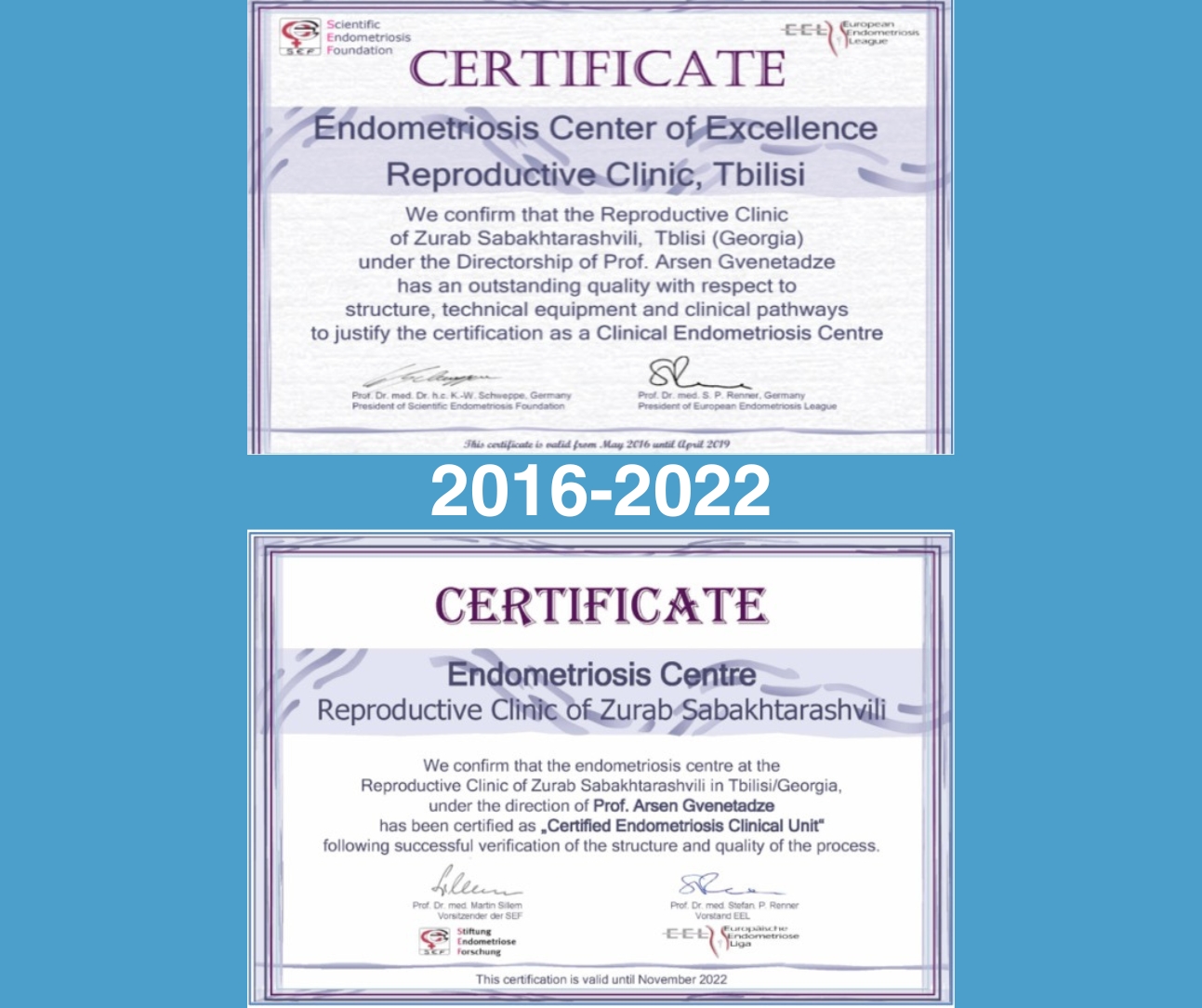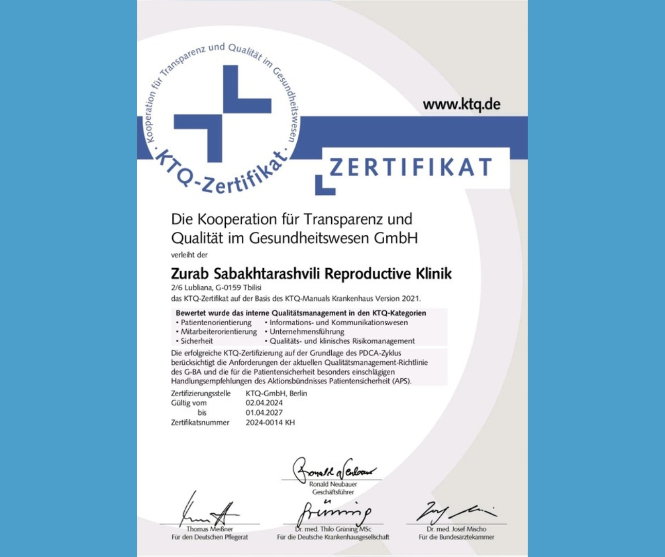 ზურაბ საბახტარაშვილის რეპროდუქციული კლინიკა აღიარებულია უწყვეტი სერტიფიცირებით 2016 წლიდან ევროპული სტანდარტების დაცვით. ამ პერიოდის განმავლობაში კლინიკამ მოიპოვა 5 სხვადასხვა სერტიფიკატი რაც მიუთითებს სტანდარტების განუხრელ დაცვაზე.